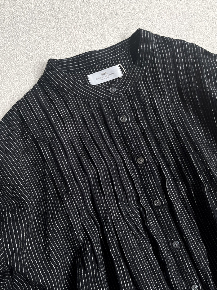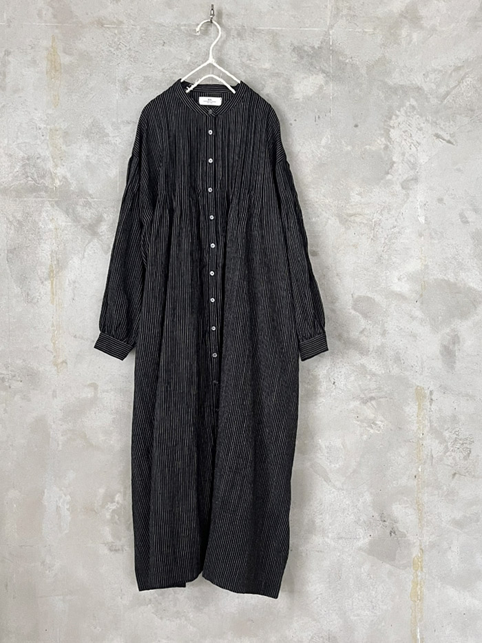 [ Wool/Linen Stripe Banded Collar Dress with Pintuck ]