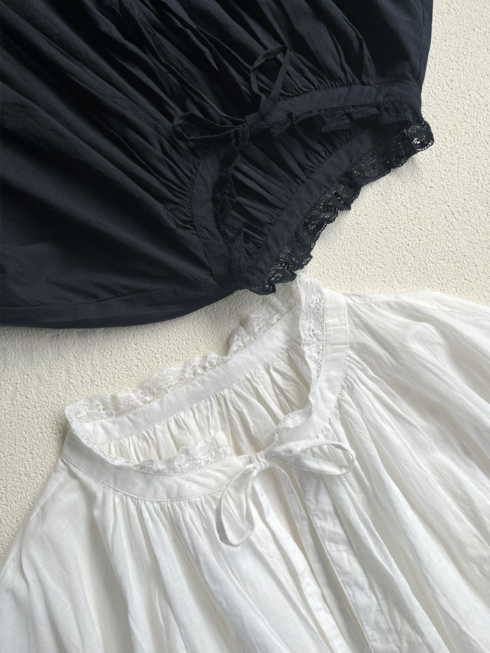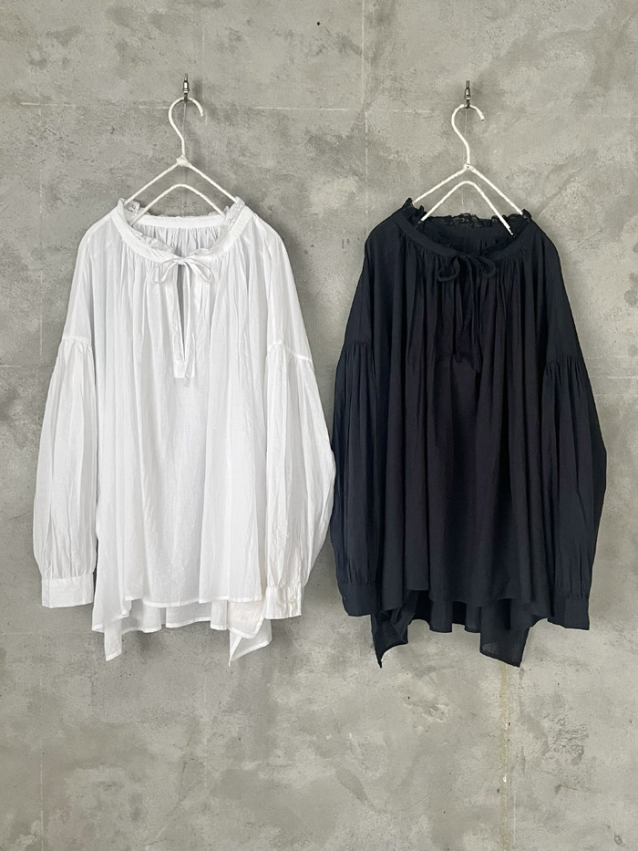 [ 60s Cambric Plain Lace & String Collar Gathered Shirt ]